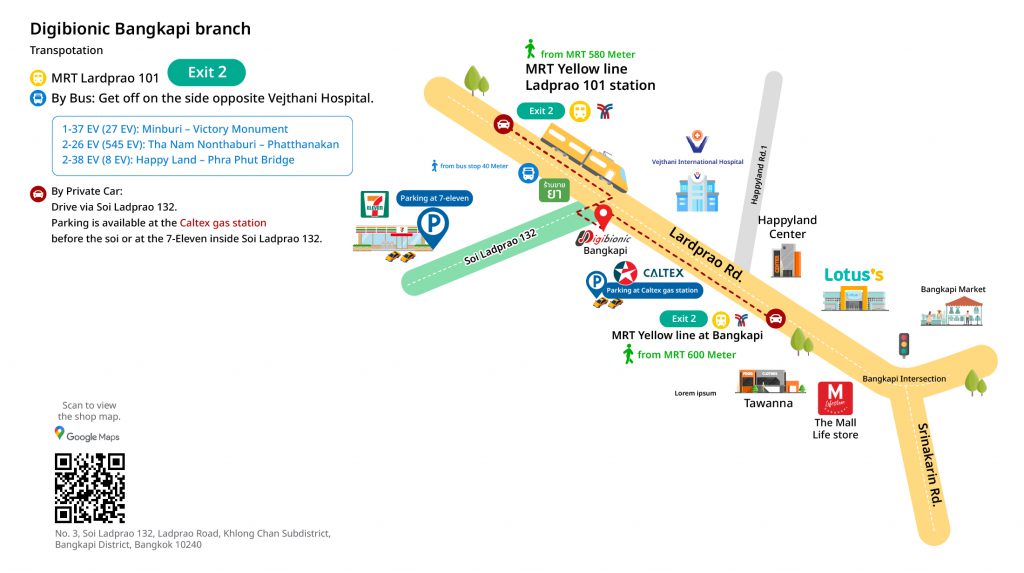 Digibionic Hearing Aid Store, Bangkapi Branch, is located on Ladprao Road, Khlong Chan Subdistrict, Bangkapi District, Bangkok 10240, near MRT Bangkapi (Yellow Line), Vejthani Hospital, Phaholyothin Pawnshop, and Caltex Gas Station.