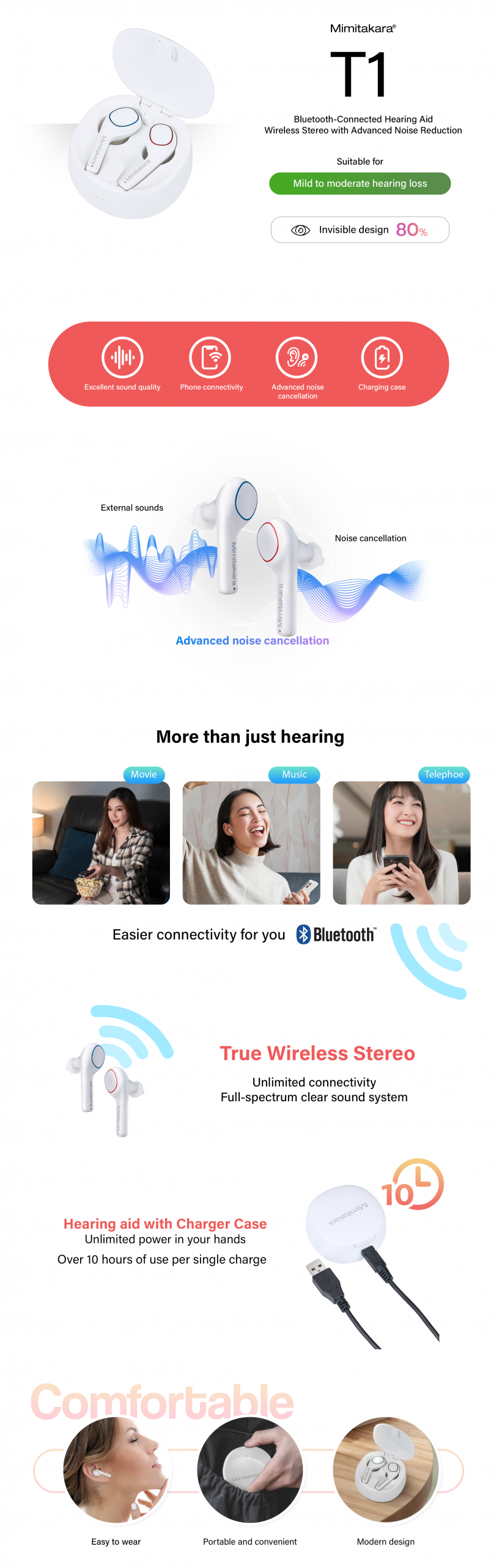 The Mimitakara T1 stands out not only as an excellent hearing aid with easy connectivity but also allows you to enjoy music, watch movies, or make phone calls effortlessly. Its compact and lightweight design makes it feel almost unnoticeable when worn. Stylish and comfortable, it features adjustable volume for clear listening, along with advanced external noise cancellation.