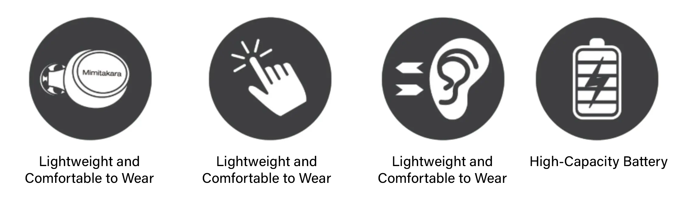 - Weight: Each hearing aid 3.3 g / Charging case 53 g