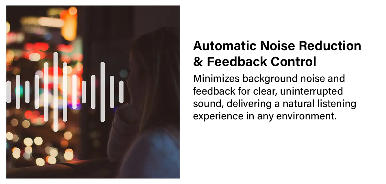 Reduces surrounding noise and prevents feedback for consistently clear sound, providing a natural listening experience in any environment.